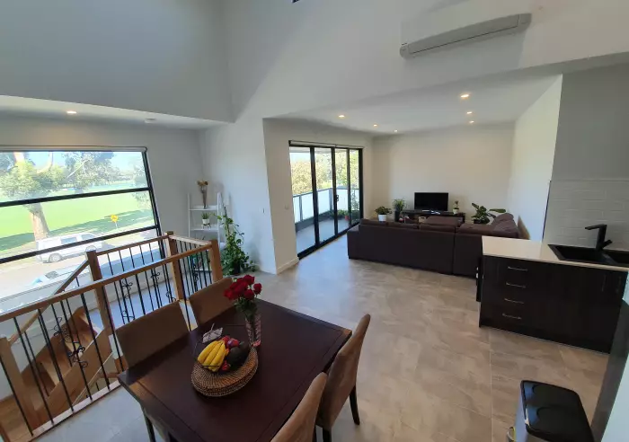 The master bedroom is conveniently located on the ground floor, complete with a private ensuite for comfort and privacy. Upstairs, enjoy reverse living with a spacious open-plan kitchen, dining, and lounge area that flows seamlessly out to a balcony  ideal for morning coffee or evening relaxation.